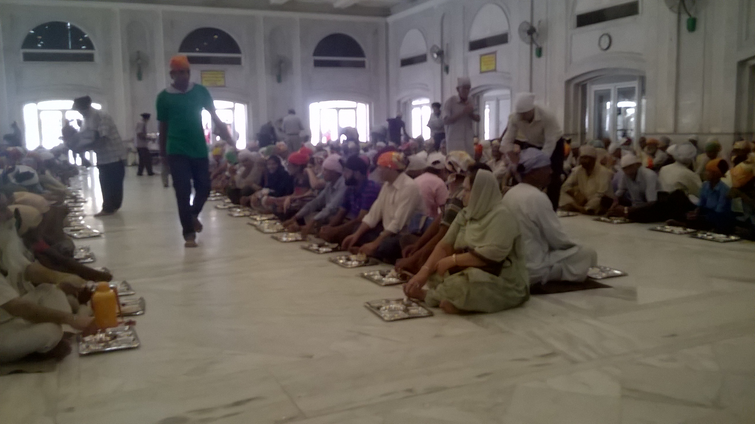 Wordlessly, wooden board was passed to me followed by a rolling pin, no one even looked aghast or quizzical or chattered behind their hands, it was all so matter of course. Soon, every few seconds, balls of dough were being flicked down the marble preparation table to me, rather like counters being flicked across a carom table. If I ran out of flour, causing my rotis to stick, I got restocked. During this whole time, no one said a word. Anyone who has spent time in India will appreciate how unusual this is. If I happened to look up from my ministrations, rather than the usual bank of stares, if I actually did manage to catch someone’s eye, I would receive a brief, encouraging smile, before eyes returned down and we carried on rolling as before. We were a bunch of people, all sitting together as equals, doing our bit to feed the masses, pilgrims and poor. I had never even rolled one roti before, but I sat there rolling roti after roti for quite some time.