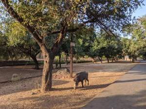 He wasn’t wrong, it’s a beautiful way to start the day, the lake on one side, enclosures on the other, some animals, like chittal and wild boar roaming free. The moon still in the sky, the sun starting to rise, birds announcing the start of the day with frantic and shrill bird song. Locals were out having their morning walk, some also cycling, all surprised by my cheerful “Good morning!”