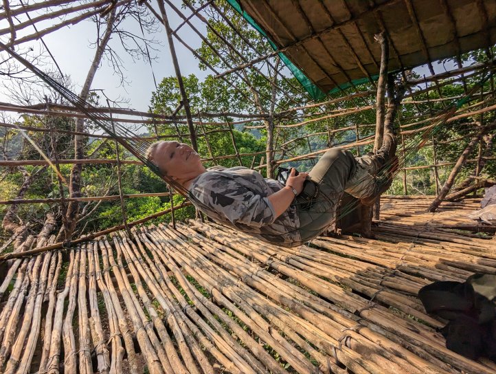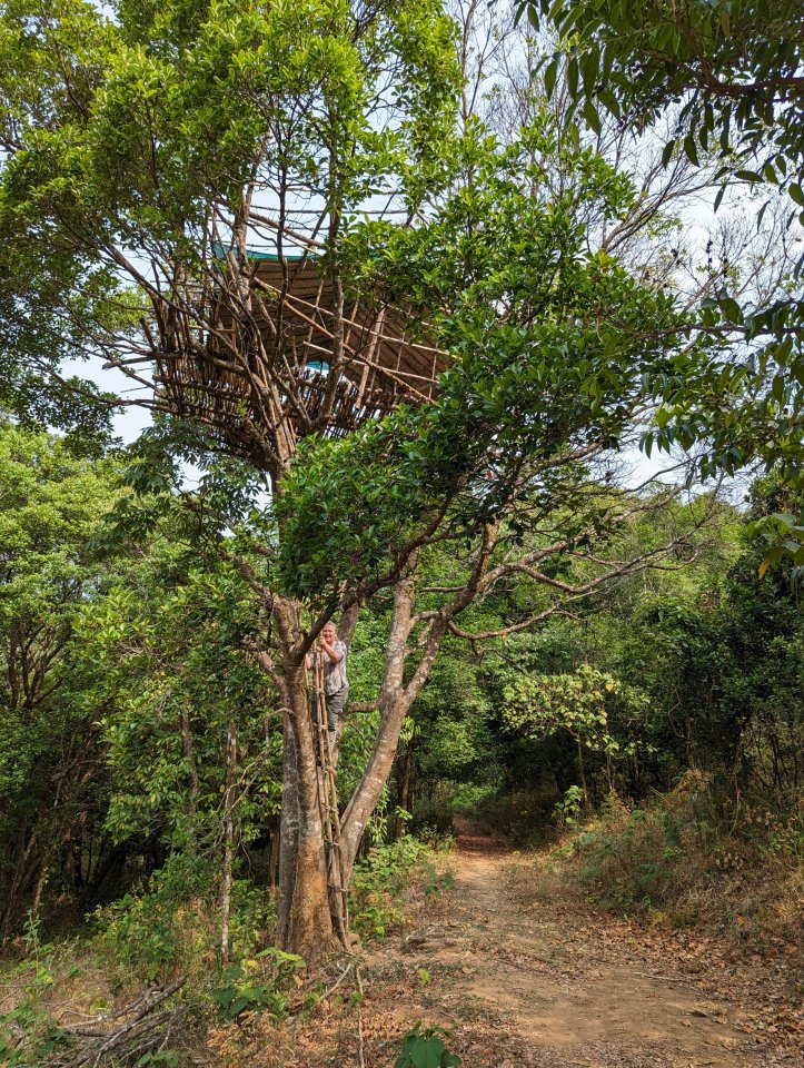 Heart rate having returned to normal, Shaji took me back to a machan (forest hide) we’d walked past the night before which I mentioned I’d like to climb up to see the view. Well I would, being all mouth before brain. It was too late to bottle out by the time we got there and so up we went. Shaji settled down to check whatsapp, its the only place to get any sort of reception and I clambered inelegantly into the hammock, another surprise! We settled in to wait to see what we might see for a good hour or so, or so I thought. The sway of the hammock in the treetop, the gentle breeze, the chatter of the insects and the ratatat of a rufous woodpecker, meant that I was soon lulled to sleep. I woke an hour or so later with a flustered, “Did I miss anything?” To which Shaji, as is his wont, as he made his way towards the ladder, replied, “No, nothing, they were probably put off by the sound as loud as a lorry thundering through the forest.